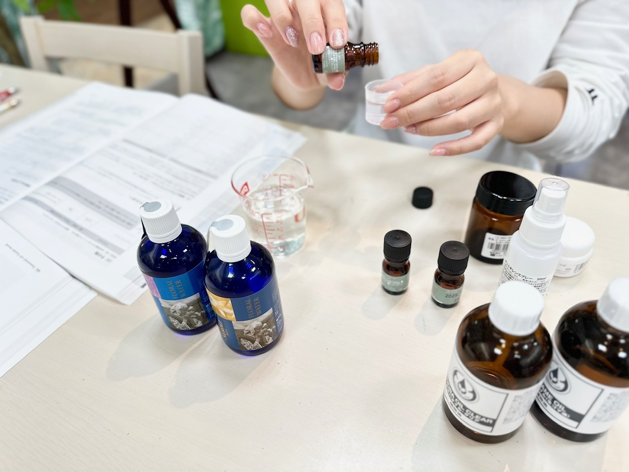 併設した生活の木パートナーショップの豊富な精油やハーブ、基材を使用したクラフト実習、サロンでのトリートメント体験を通してアロマコーディネーターに必要な知識を楽しく学びましょう。